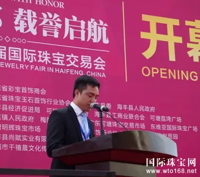 中共海丰县委副书记、海丰县人民政府县长陈德忠在致辞中指出:中国•海丰首届国际珠宝交易会系列活动在海丰县可塘镇盛大开启,这是海丰县继去年成功举行中国•海丰首届珠宝文化节之后,隆重举办的又一场国际珠宝交易盛会,是海丰县全面展示珠宝首饰产业发展成果,着力打响珠宝首饰特色品牌的又一项重要举措,对于推动珠宝首饰产业加快转型升级,提高发展档次和市场竞争力,以及推介海丰的投资创业环境,具有十分重要的意义。近年来,海丰县在全面推进经济社会振兴发展中,坚持立足传统特色产业的良好发展势头,加强政府职能服务和政策引导、扶持,加快产业园区、专业市场等载体建设,推动珠宝首饰等特色产业不断发展壮大。其中,可塘彩色宝石加工业经过多年的开拓、发展,已成为海丰县域经济的重要支柱产业。据初步统计,2014年全县珠宝首饰销售量超过5亿件,销售总额达295亿元,水晶产品占全世界加工总量的70%以上,“海丰彩宝”在国内国际珠宝市场的份额正在迅速攀升,占据着越来越重要的地位。今年8月以来,海丰县先后获得“中国彩色宝石之都”和“中国珠宝玉石首饰特色产业基地”的称号,这必将进一步打响海丰珠宝首饰产业在国内国际的区域性品牌,有力促进海丰彩宝生产销售基地和研发设计中心的建设、打造,加快实现我县珠宝首饰产业由“海丰制造”向“海丰创造”转变。本次国际珠宝交易会在广东省彩宝首饰商会以及相关单位和机构的精心组织和筹划下,历经一年时间的筹办,活动丰富多彩,展会高端大气,聚集了海丰本地乃至国内国际企业设计新颖、工艺优良的珠宝首饰精品,为珠宝业界搭建了一个品牌推广、信息交流、商贸洽谈的重要平台。